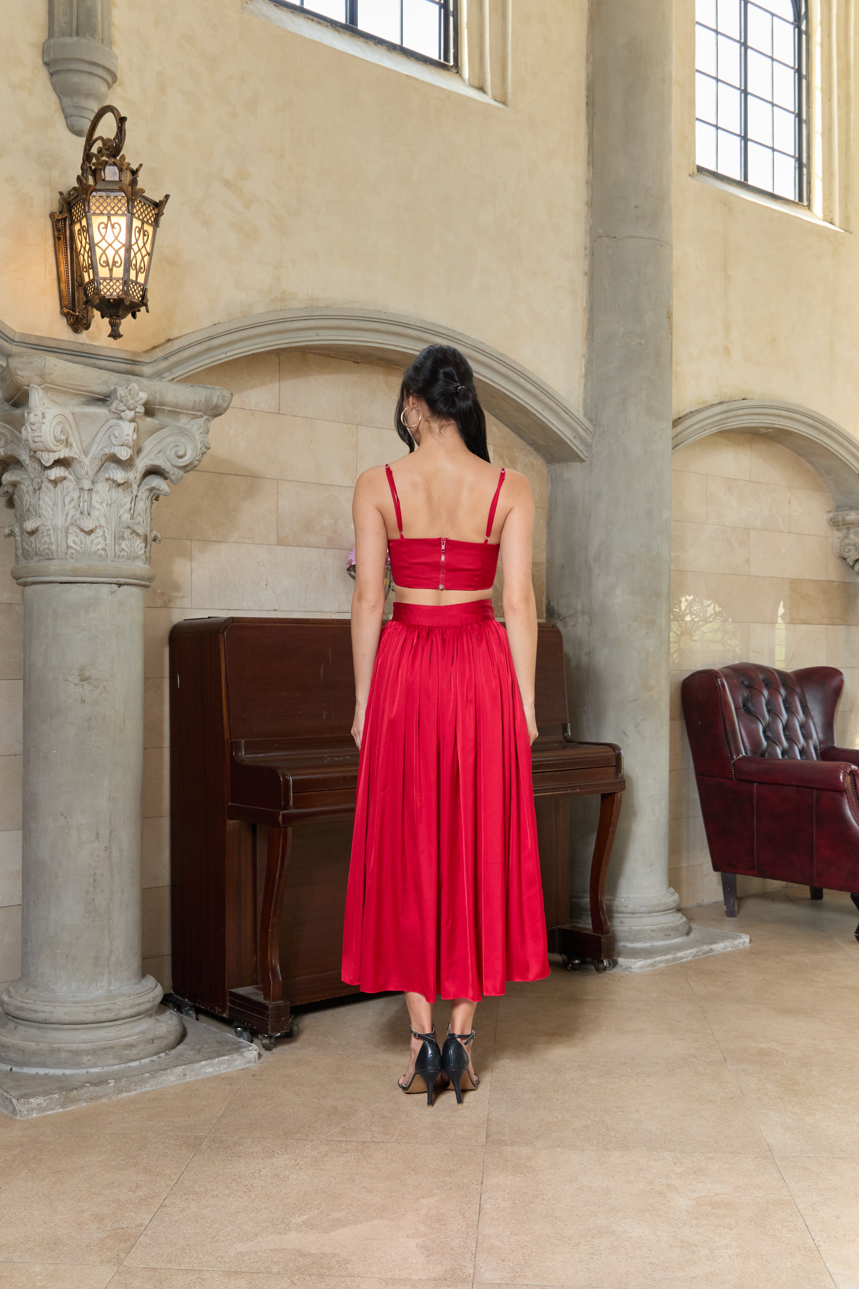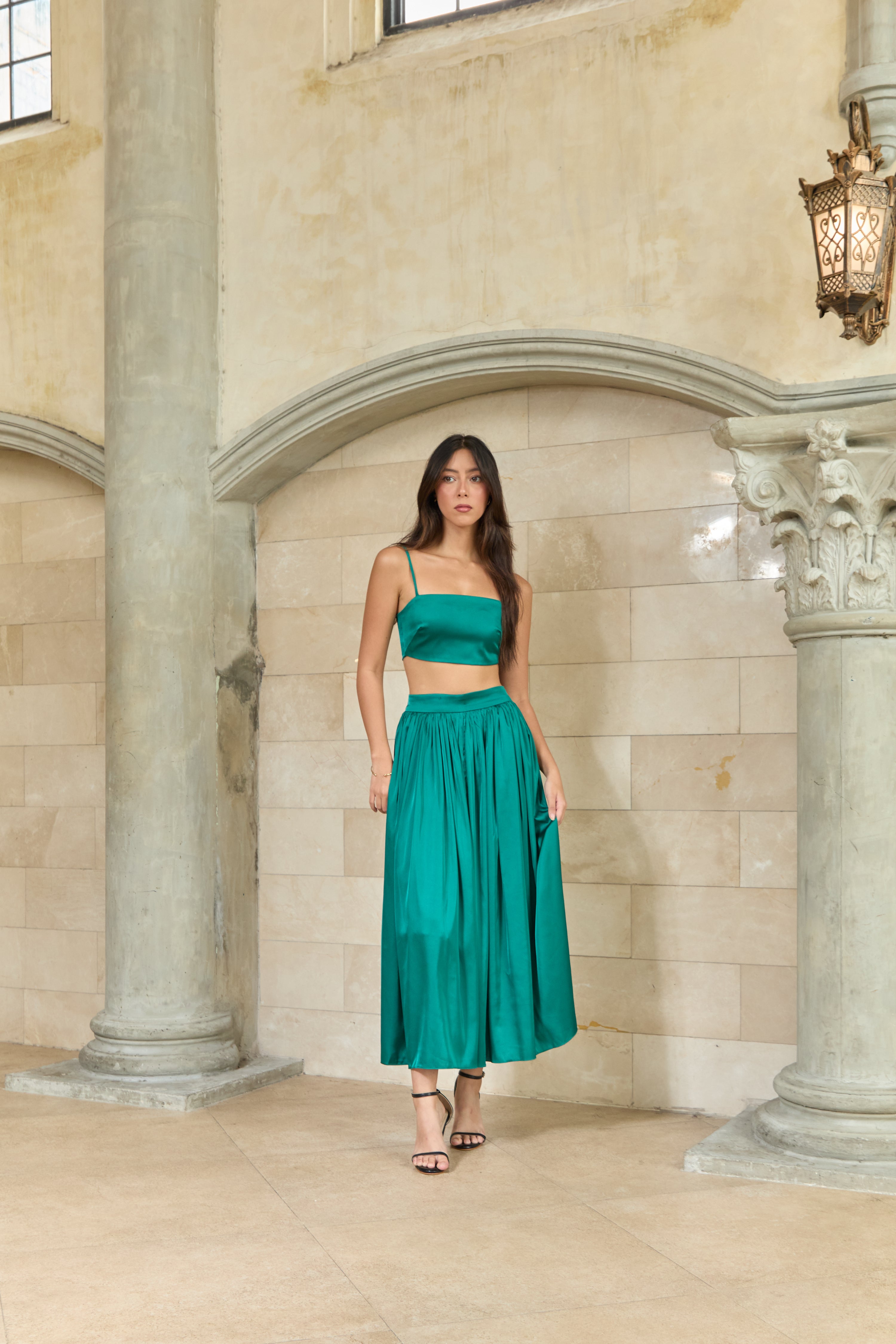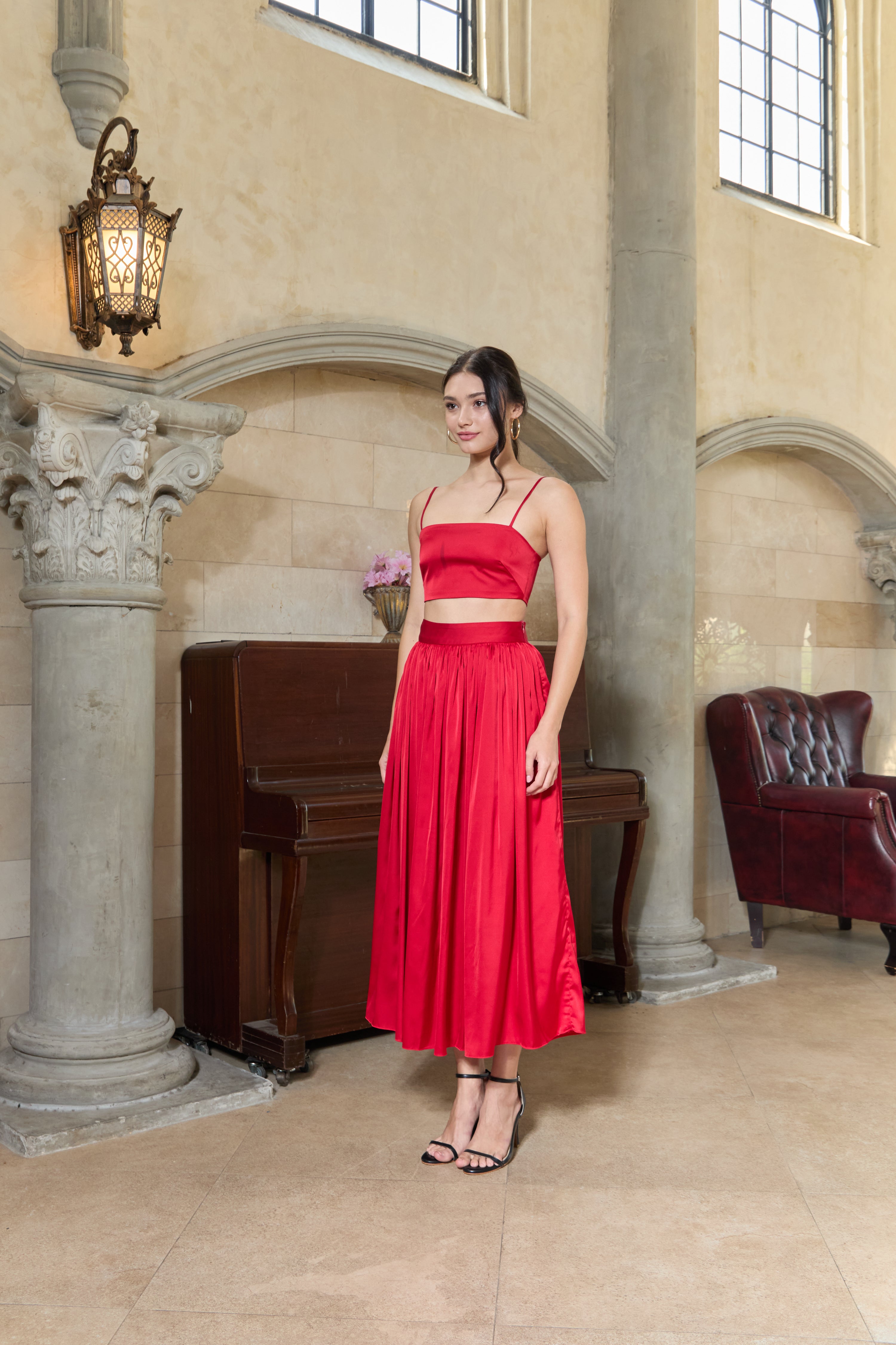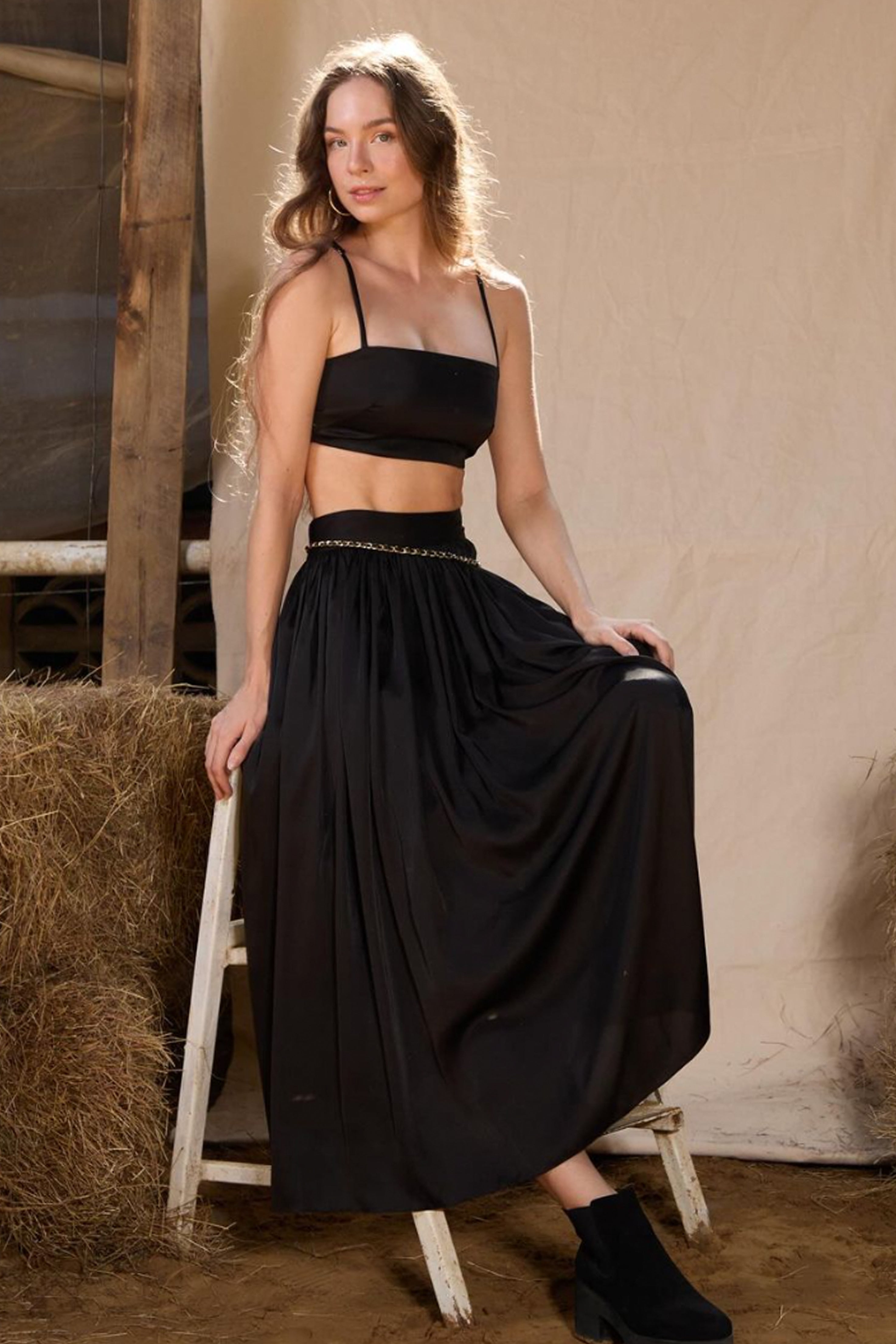A SLEEK SATIN CROP TOP WITH DELICATE SPAGHETTI STRAPS AND A FLOWING HIGH-WAISTED SKIRT ADORNED WITH SUBTLE PLEATS. THE ADDITION OF A CHIC CHAIN ACCENT BRINGS A MODERN EDGE, MAKING IT THE PERFECT CHOICE FOR BOTH FORMAL EVENTS AND STYLISH GATHERINGS. EMBRACE THE LUXURIOUS FEEL OF SATIN WHILE MAKING A BOLD FASHION STATEMENT EFFORTLESSLY.