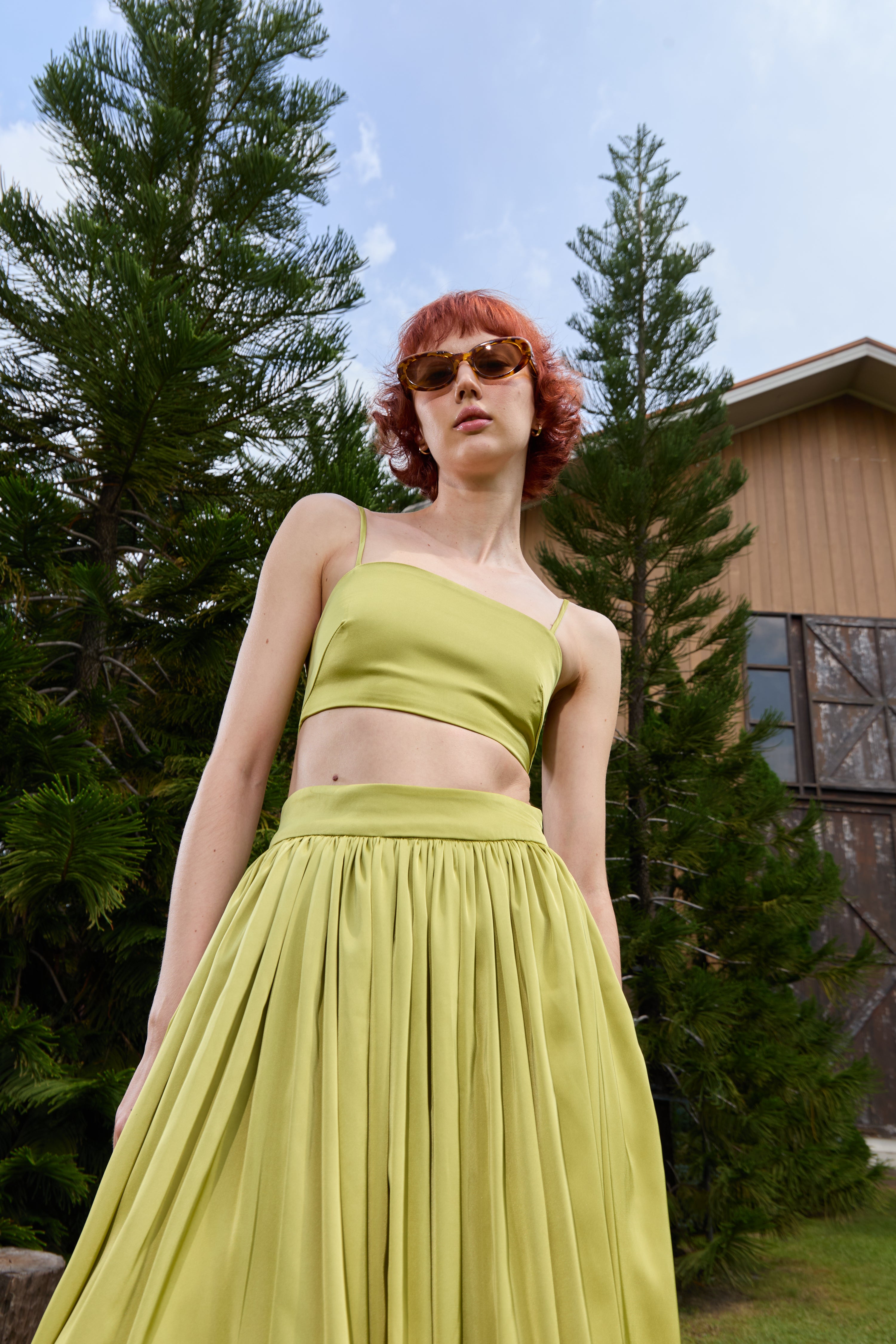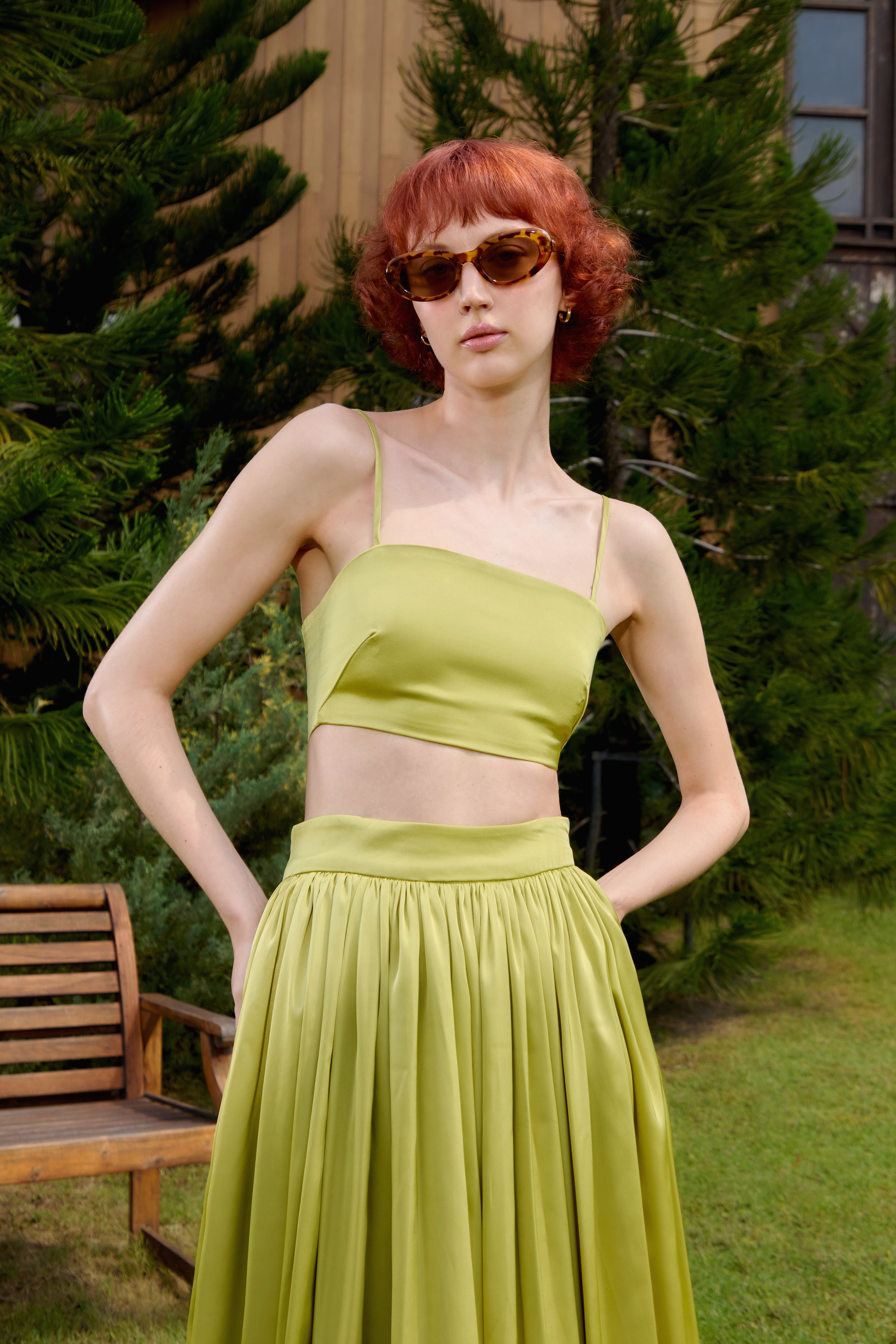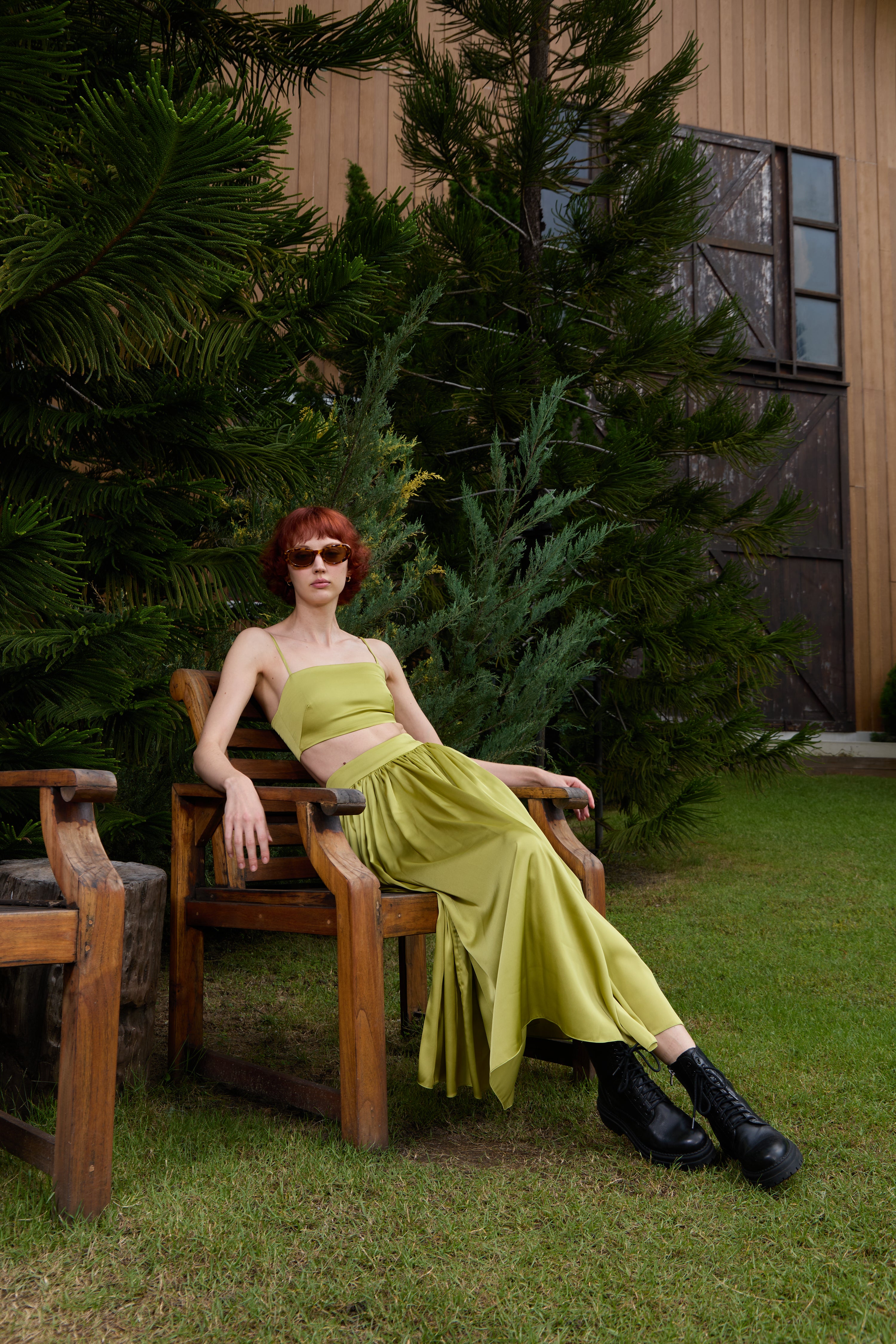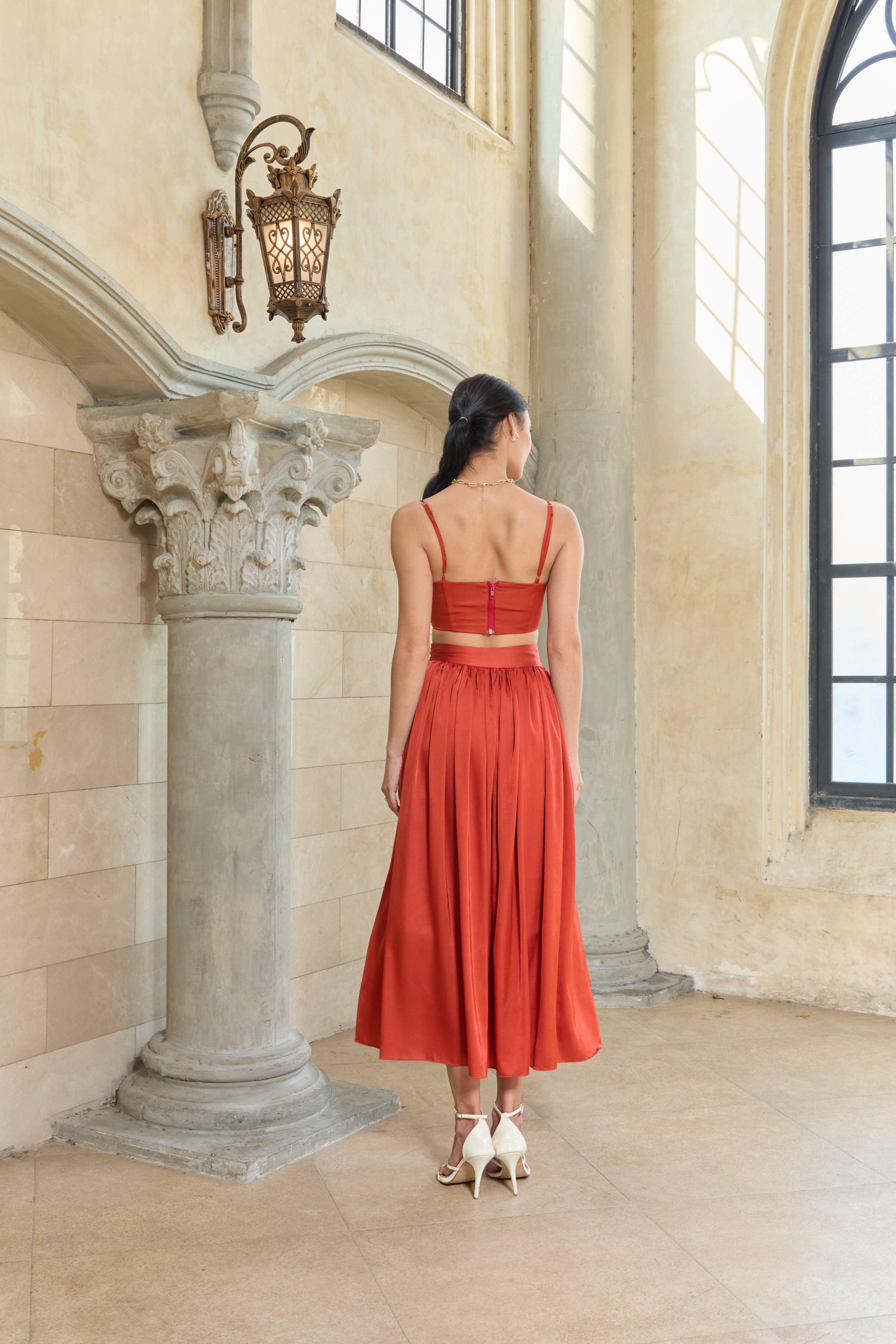 A SLEEK SATIN CROP TOP WITH DELICATE SPAGHETTI STRAPS AND A FLOWING HIGH-WAISTED SKIRT ADORNED WITH SUBTLE PLEATS. THE ADDITION OF A CHIC CHAIN ACCENT BRINGS A MODERN EDGE, MAKING IT THE PERFECT CHOICE FOR BOTH FORMAL EVENTS AND STYLISH GATHERINGS. EMBRACE THE LUXURIOUS FEEL OF SATIN WHILE MAKING A BOLD FASHION STATEMENT EFFORTLESSLY.