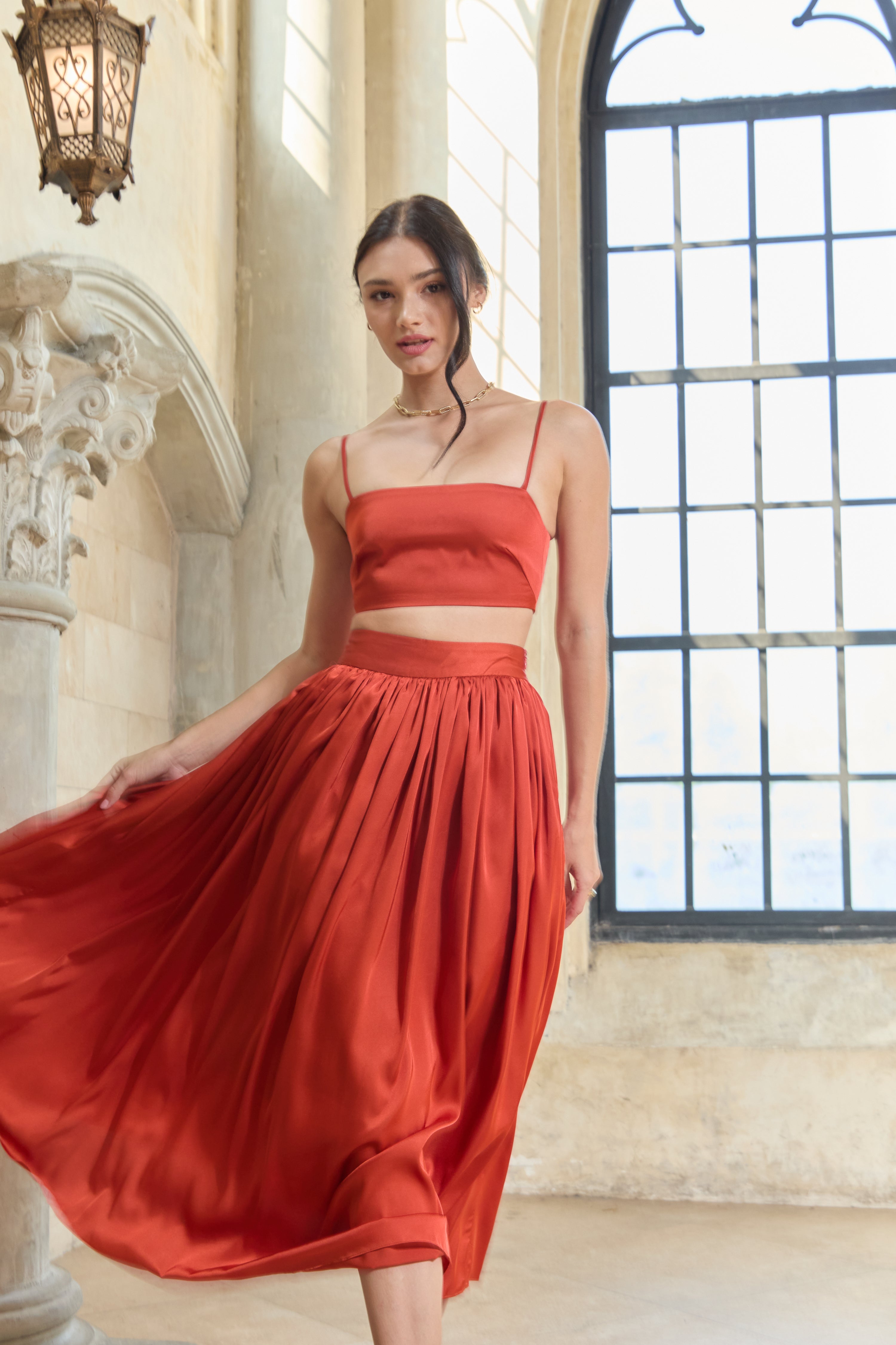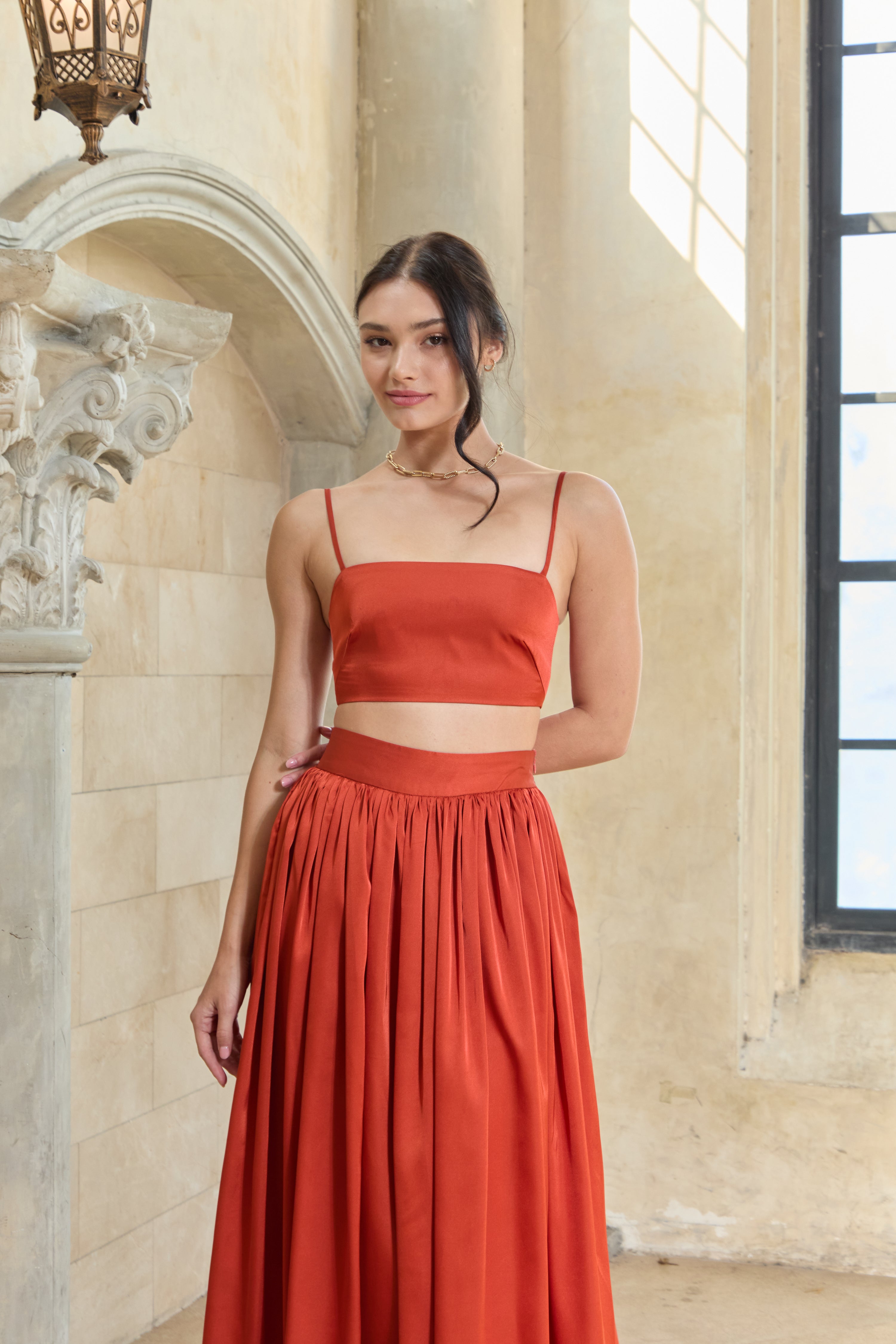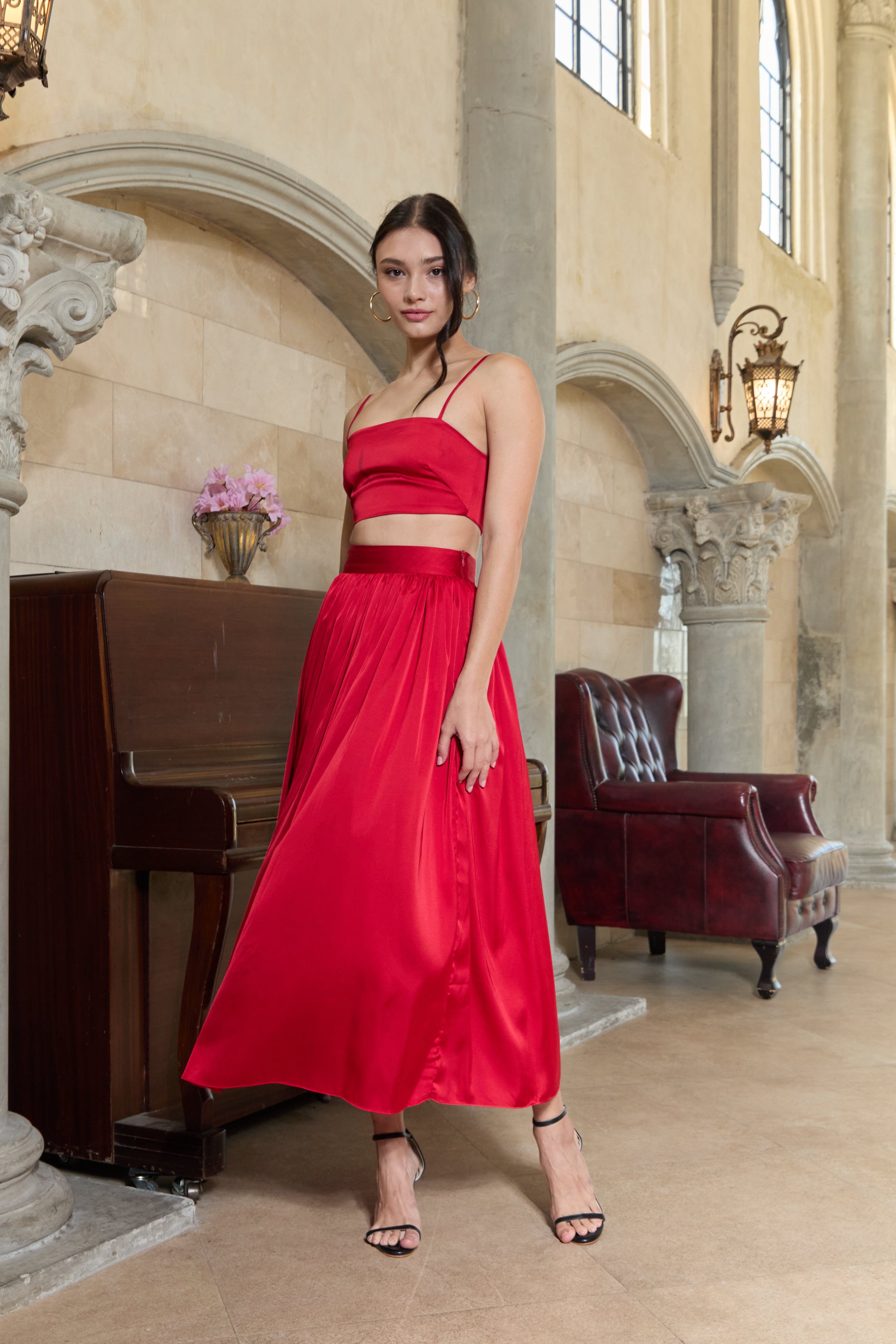 xA SLEEK SATIN CROP TOP WITH DELICATE SPAGHETTI STRAPS AND A FLOWING HIGH-WAISTED SKIRT ADORNED WITH SUBTLE PLEATS. THE ADDITION OF A CHIC CHAIN ACCENT BRINGS A MODERN EDGE, MAKING IT THE PERFECT CHOICE FOR BOTH FORMAL EVENTS AND STYLISH GATHERINGS. EMBRACE THE LUXURIOUS FEEL OF SATIN WHILE MAKING A BOLD FASHION STATEMENT EFFORTLESSLY.
