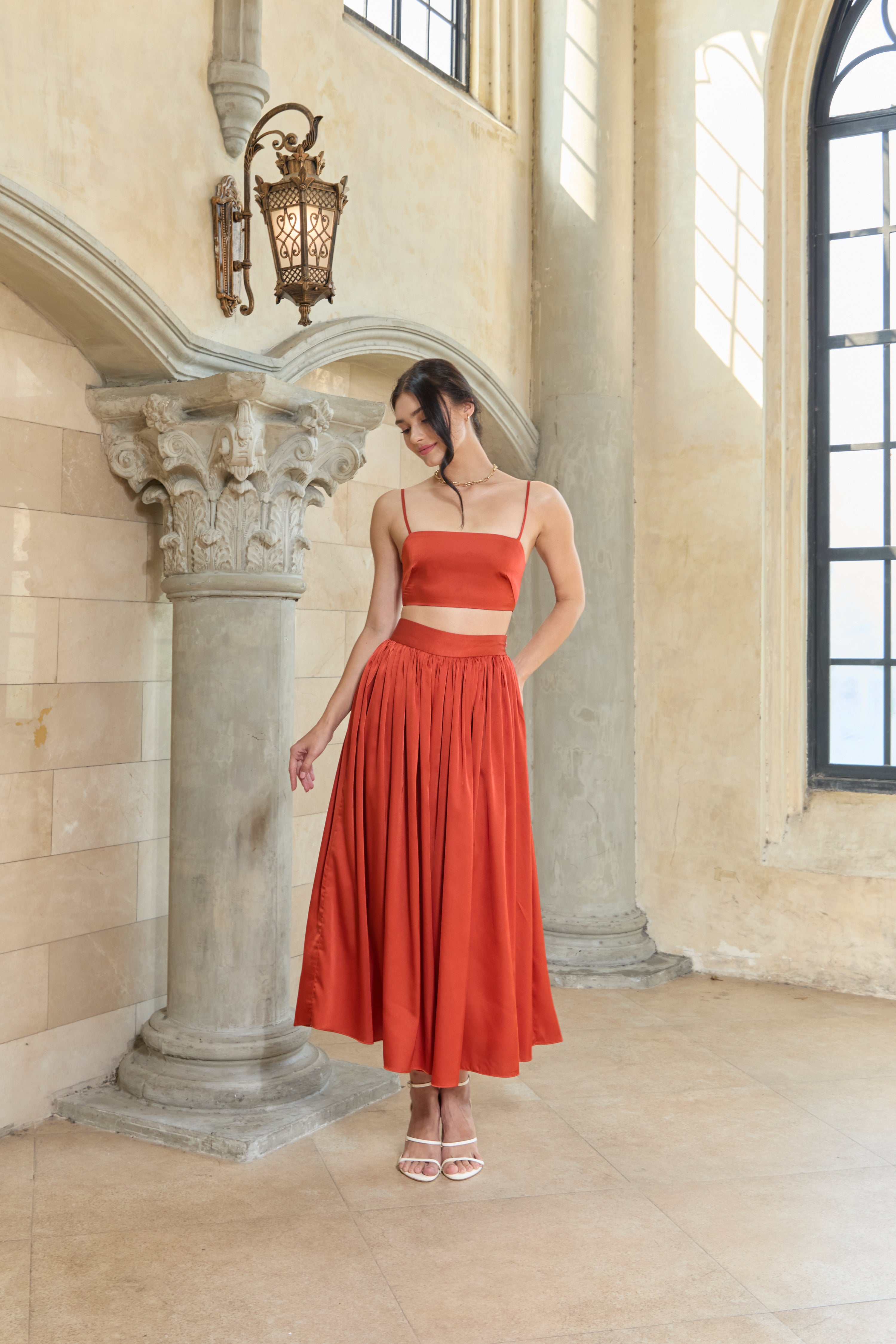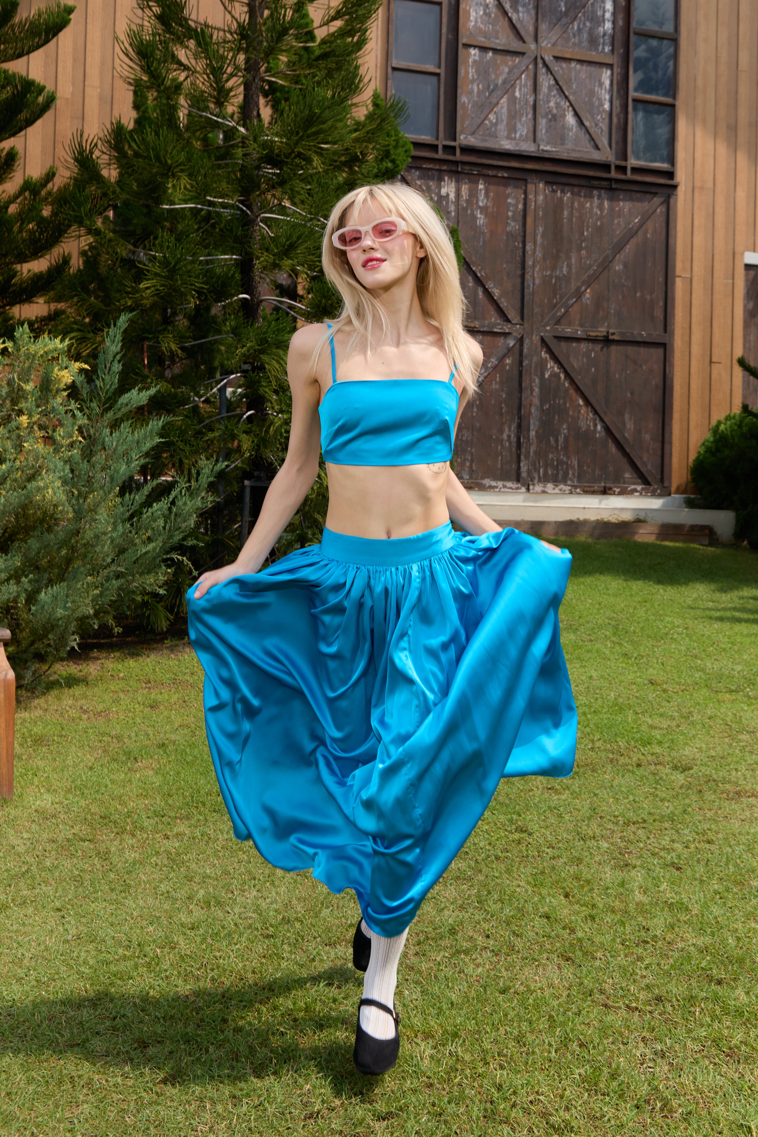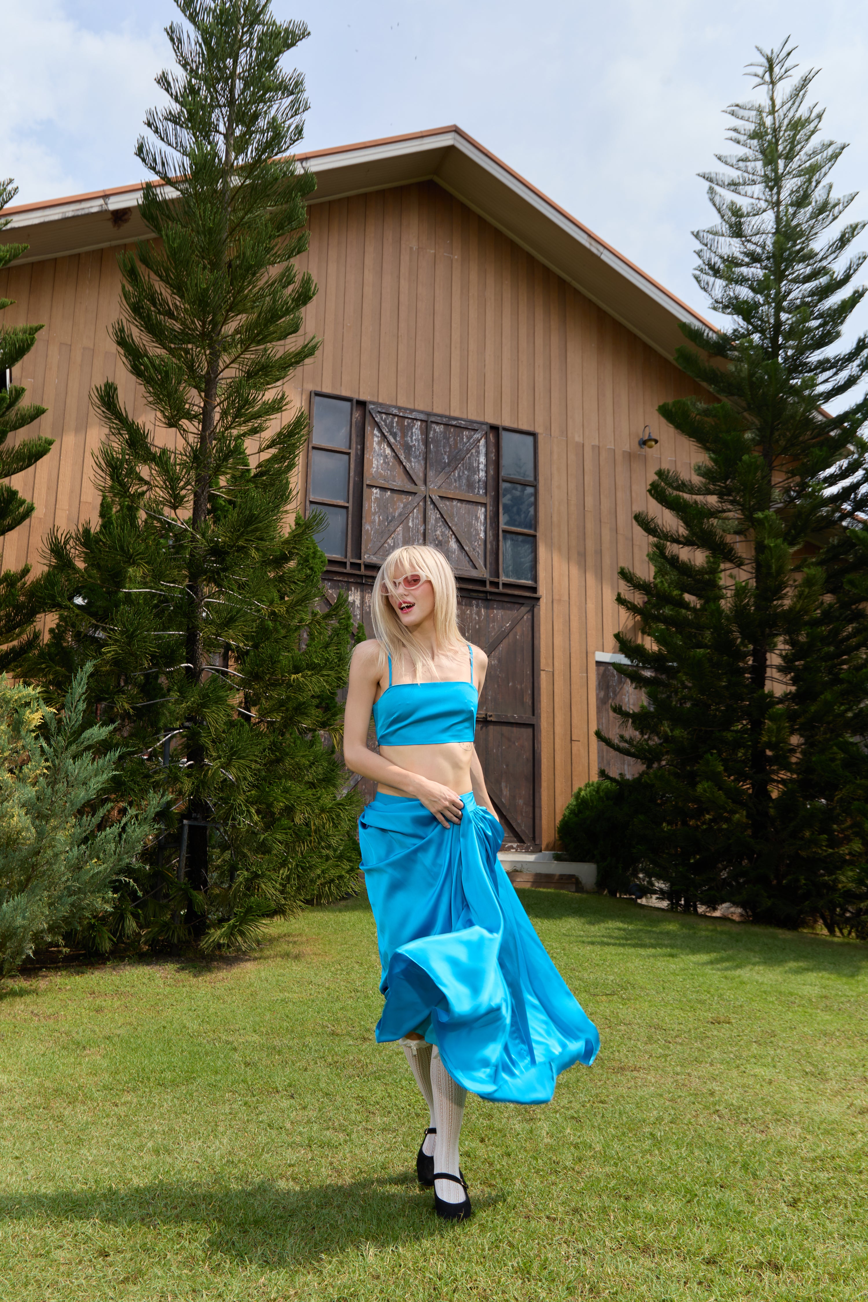xA SLEEK SATIN CROP TOP WITH DELICATE SPAGHETTI STRAPS AND A FLOWING HIGH-WAISTED SKIRT ADORNED WITH SUBTLE PLEATS. THE ADDITION OF A CHIC CHAIN ACCENT BRINGS A MODERN EDGE, MAKING IT THE PERFECT CHOICE FOR BOTH FORMAL EVENTS AND STYLISH GATHERINGS. EMBRACE THE LUXURIOUS FEEL OF SATIN WHILE MAKING A BOLD FASHION STATEMENT EFFORTLESSLY.