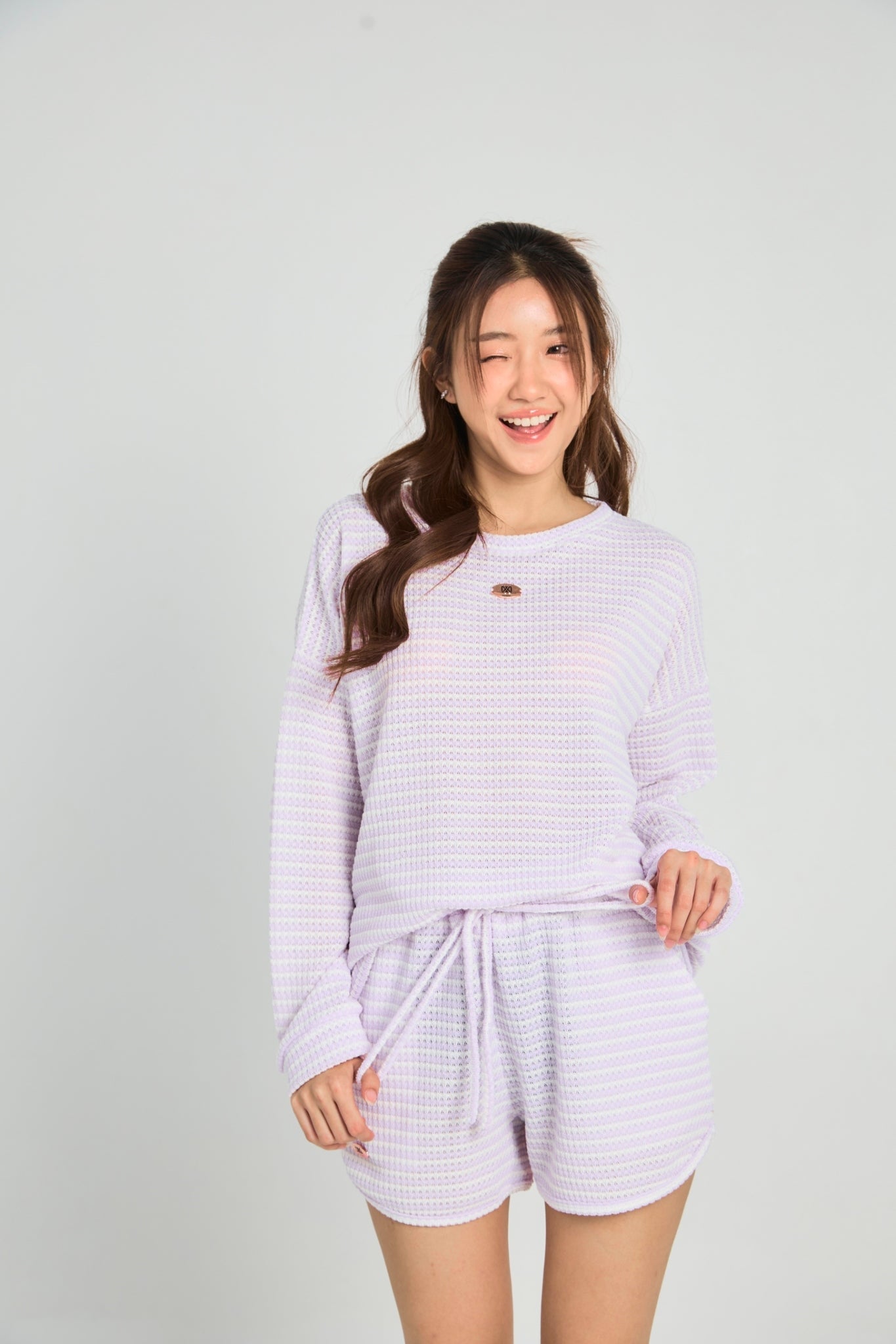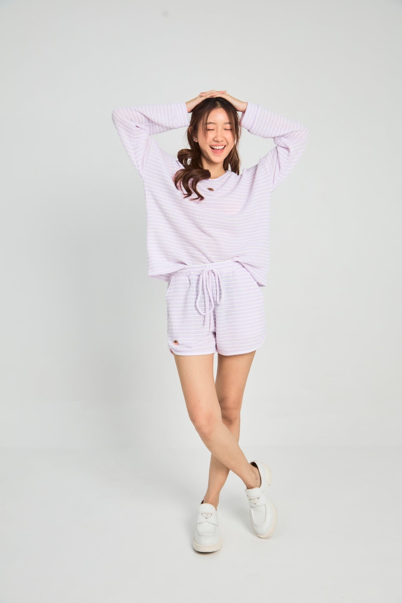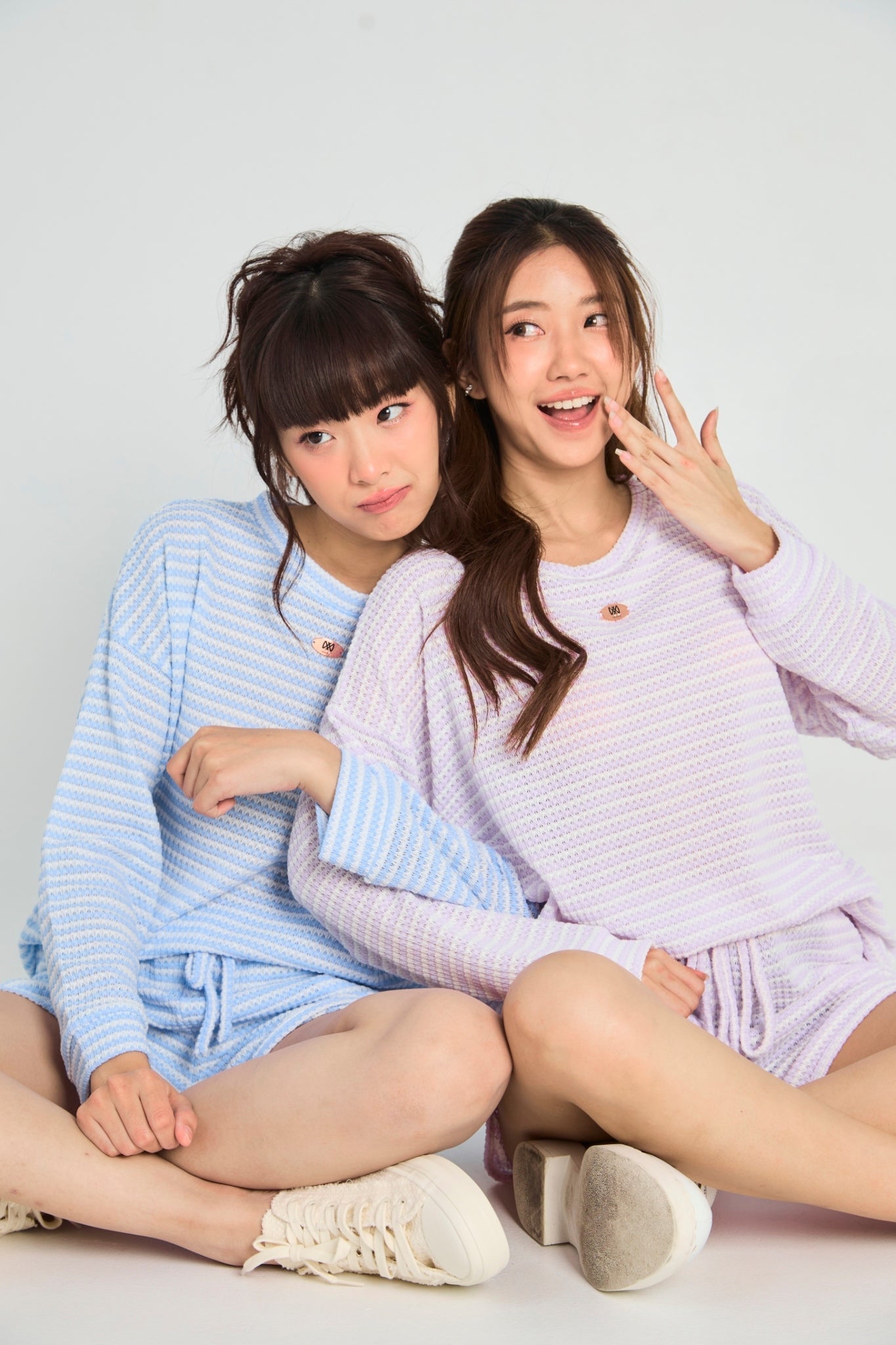 xGET COZY IN STYLE WITH THIS RELAXED-FIT STRIPED KNIT LOUNGEWEAR SET, AVAILABLE IN PASTEL BLUE AND LAVENDER. FEATURING A LONG-SLEEVED TOP AND MATCHING DRAWSTRING SHORTS, THIS SET IS DESIGNED FOR ULTIMATE COMFORT WHILE LOUNGING AT HOME OR ENJOYING CASUAL WEEKENDS. THE LIGHTWEIGHT KNIT FABRIC IS SOFT AGAINST THE SKIN, MAKING IT PERFECT FOR COZY DAYS IN OR LAID-BACK OUTINGS. THE SOFT PASTEL STRIPES ADD A PLAYFUL TOUCH, ENSURING YOU LOOK CUTE AND FEEL COMFORTABLE ALL DAY.