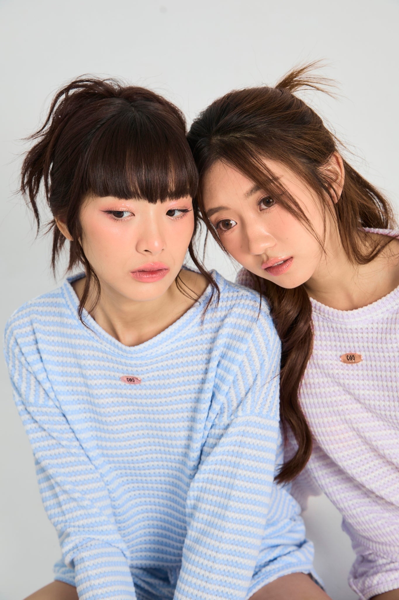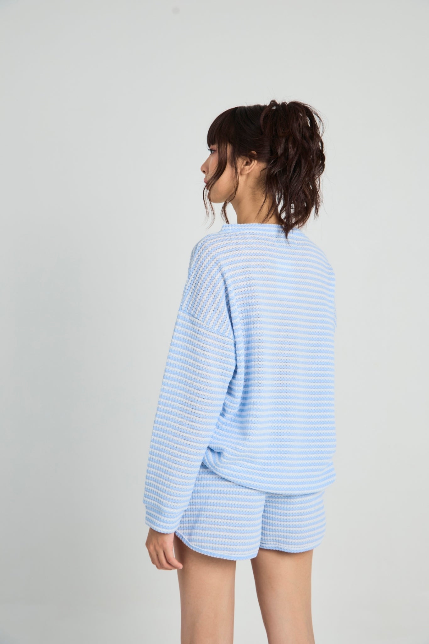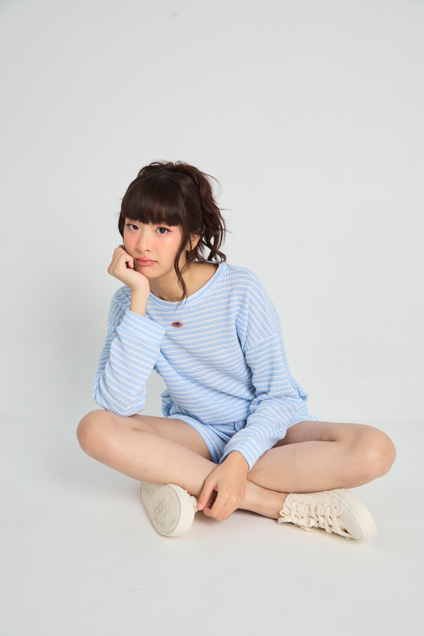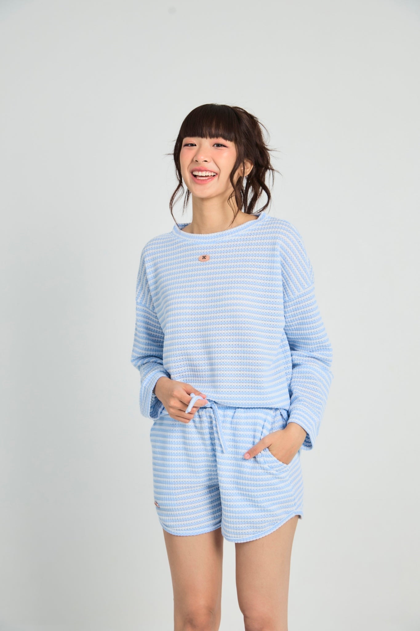 xGET COZY IN STYLE WITH THIS RELAXED-FIT STRIPED KNIT LOUNGEWEAR SET, AVAILABLE IN PASTEL BLUE AND LAVENDER. FEATURING A LONG-SLEEVED TOP AND MATCHING DRAWSTRING SHORTS, THIS SET IS DESIGNED FOR ULTIMATE COMFORT WHILE LOUNGING AT HOME OR ENJOYING CASUAL WEEKENDS. THE LIGHTWEIGHT KNIT FABRIC IS SOFT AGAINST THE SKIN, MAKING IT PERFECT FOR COZY DAYS IN OR LAID-BACK OUTINGS. THE SOFT PASTEL STRIPES ADD A PLAYFUL TOUCH, ENSURING YOU LOOK CUTE AND FEEL COMFORTABLE ALL DAY.