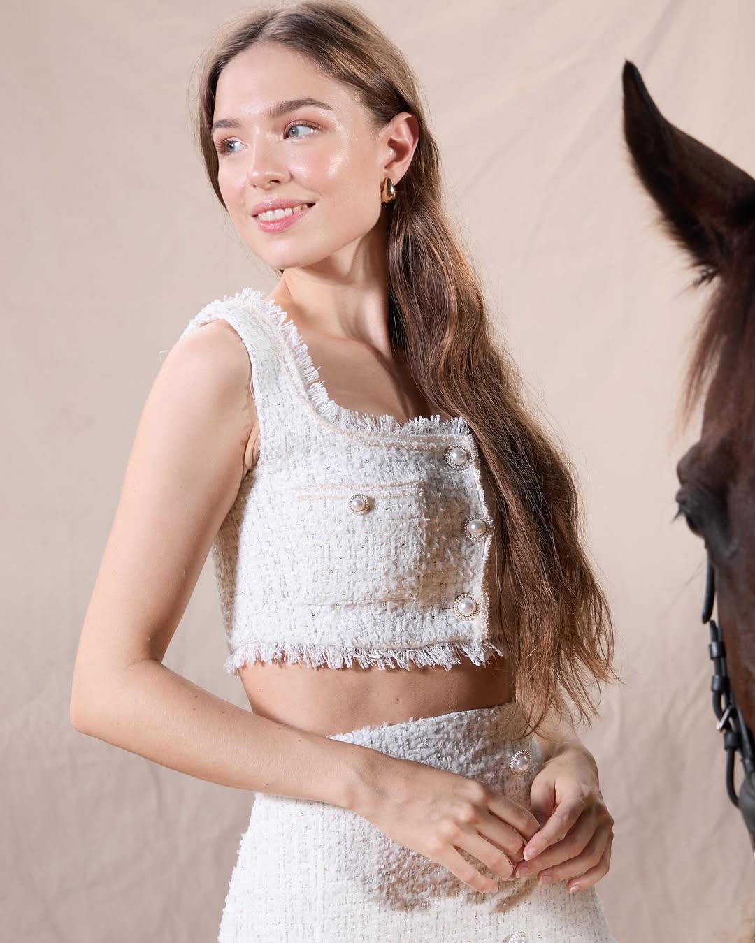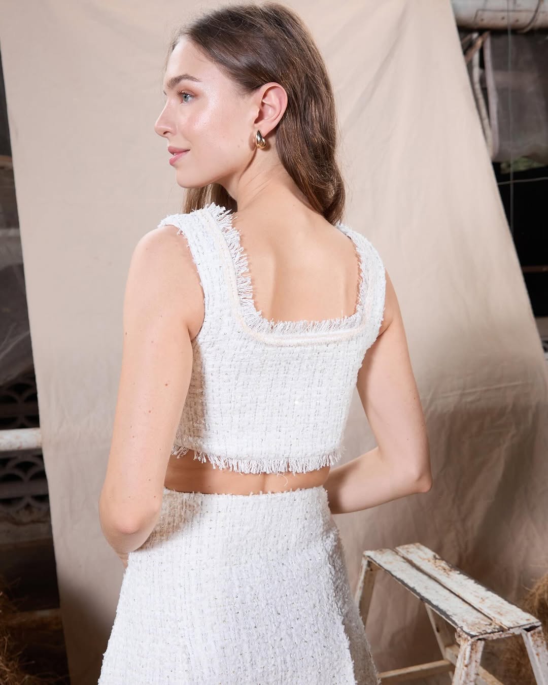 xA CHIC COMBINATION OF REFINED TEXTURE AND MODERN DESIGN. THIS SET FEATURES A CROPPED TWEED TOP AND A MATCHING MINI SKIRT WITH FRAYED DETAILS, PERFECT FOR AN EFFORTLESSLY POLISHED LOOK. IDEAL FOR OUTDOOR STROLLS OR ELEGANT GATHERINGS, THIS SET COMBINES COMFORT AND STYLE IN EVERY DETAIL.