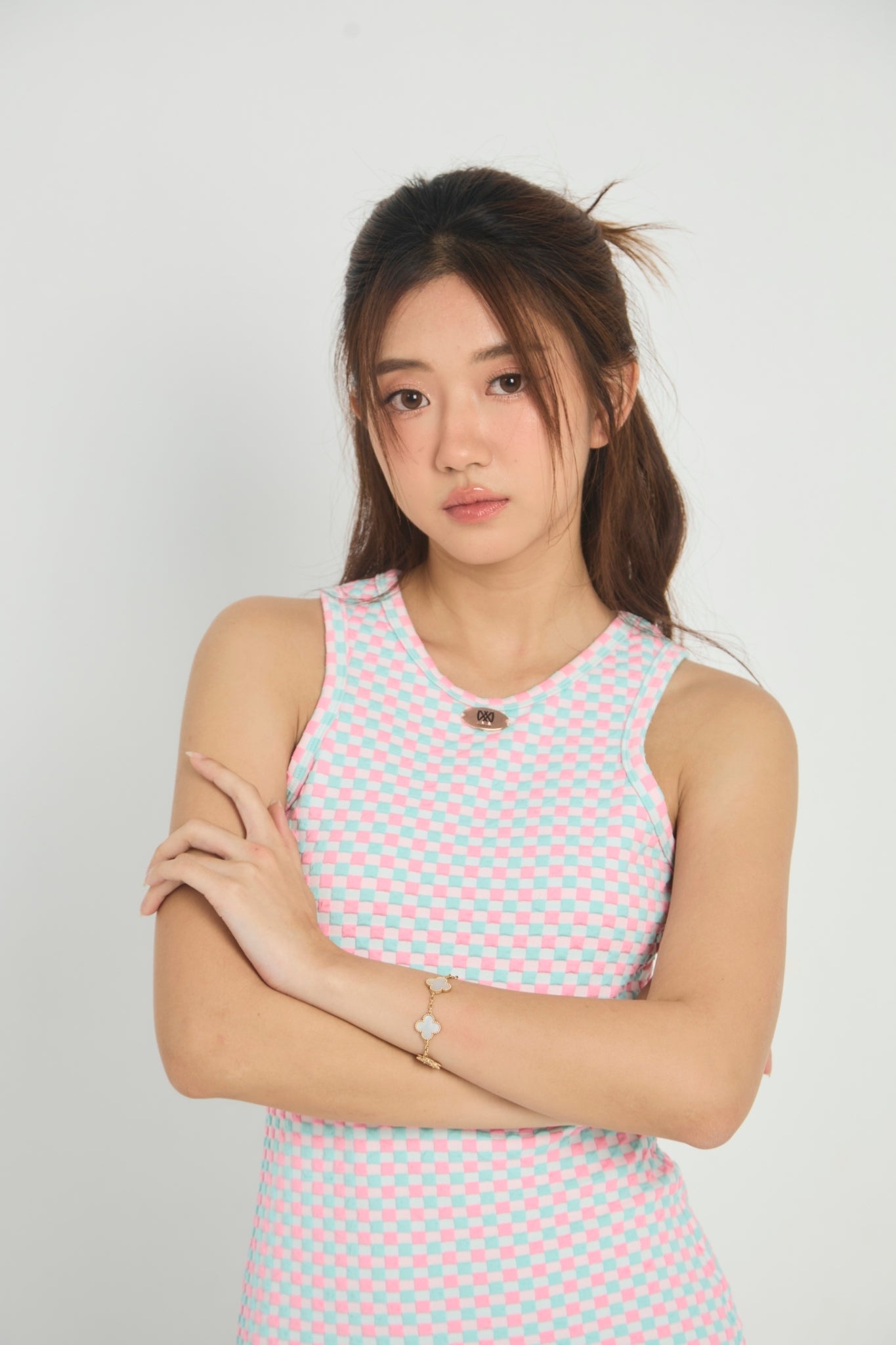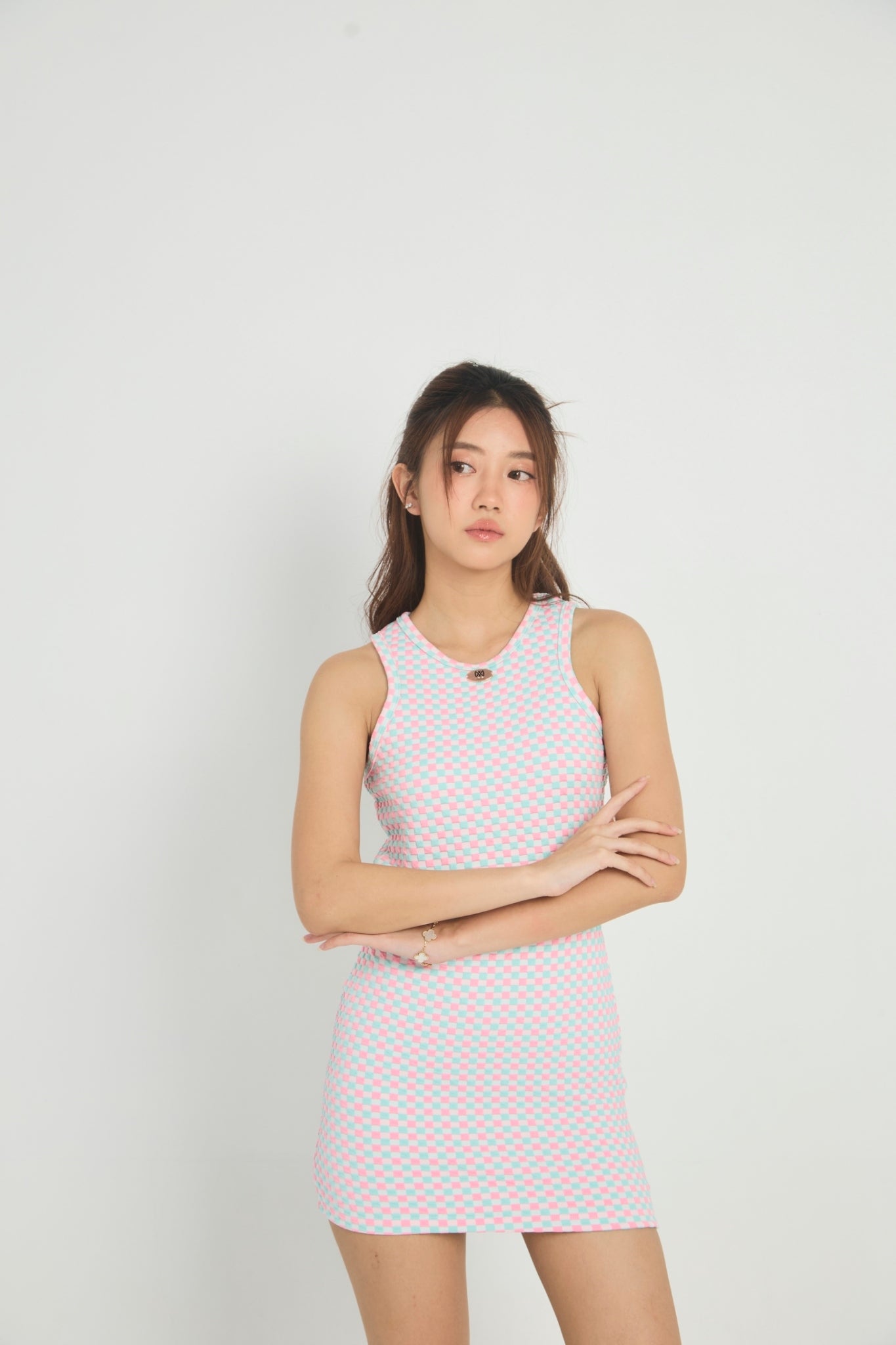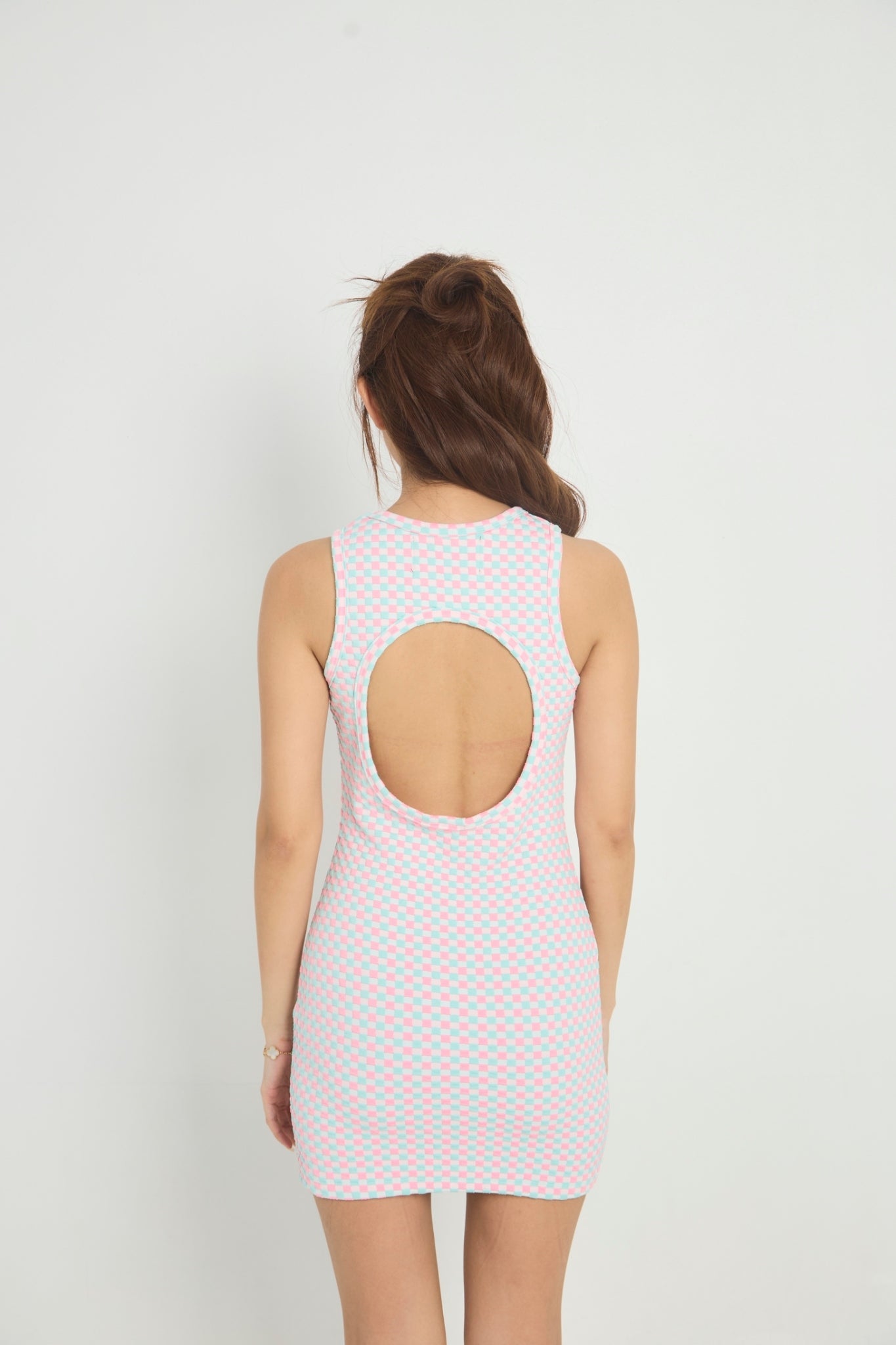 xADD A PLAYFUL TOUCH TO YOUR WARDROBE WITH THIS RETRO-INSPIRED CHECKERBOARD KNIT MINI DRESS. FEATURING A PASTEL PINK AND MINT GREEN CHECKERBOARD PATTERN, THIS SLEEVELESS DRESS IS PERFECT FOR CASUAL OUTINGS OR FUN GATHERINGS. THE FITTED SILHOUETTE AND SOFT RIBBED KNIT FABRIC ENSURE A COMFORTABLE, FLATTERING FIT THAT HUGS YOUR CURVES. DESIGNED FOR EASE AND STYLE, THIS MINI DRESS MAKES A BOLD STATEMENT WHILE STAYING EFFORTLESSLY CHIC.