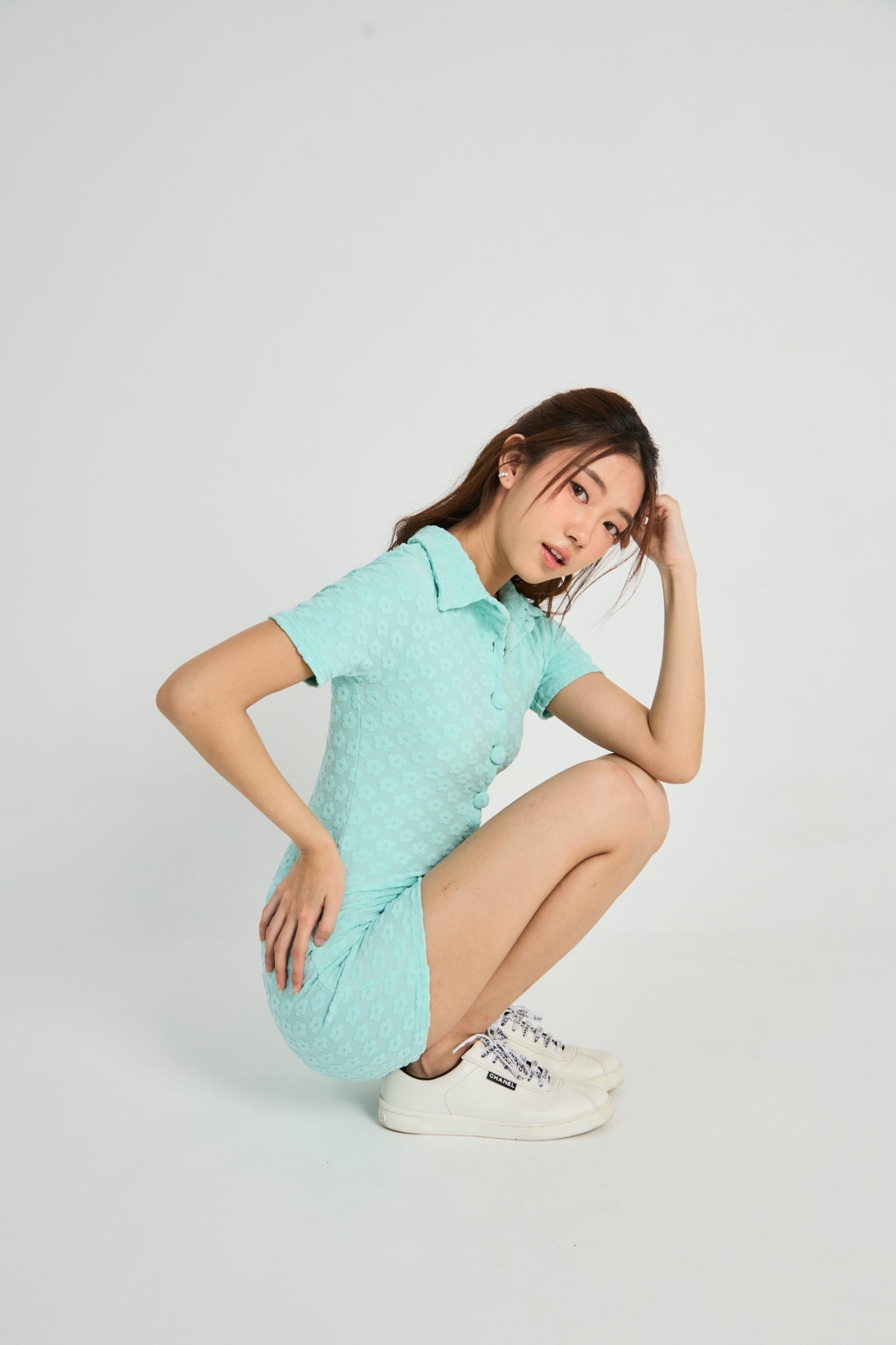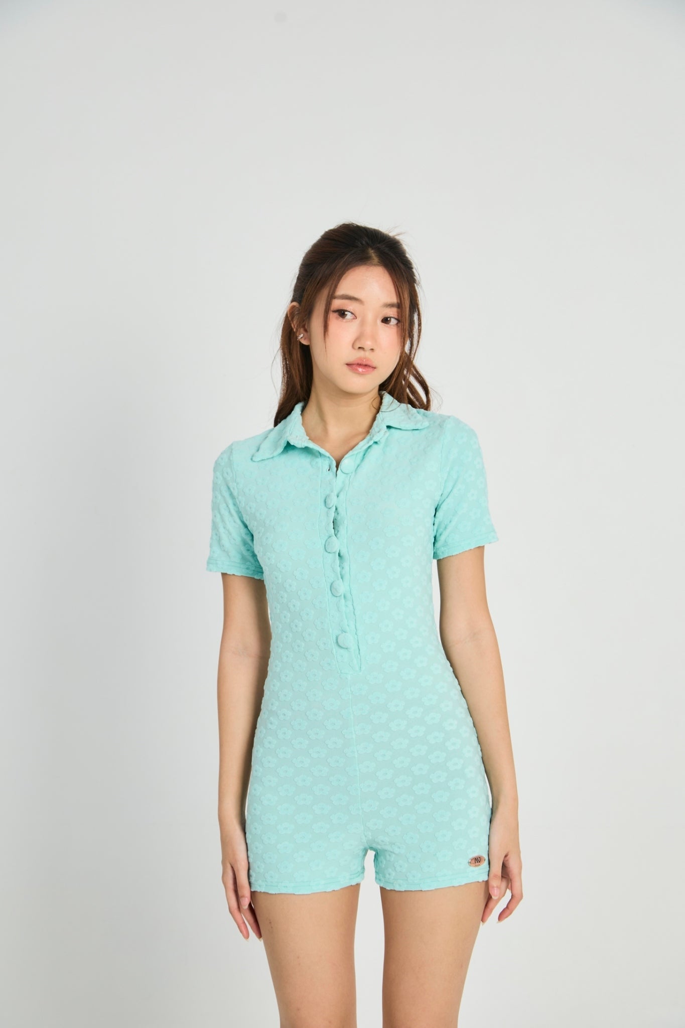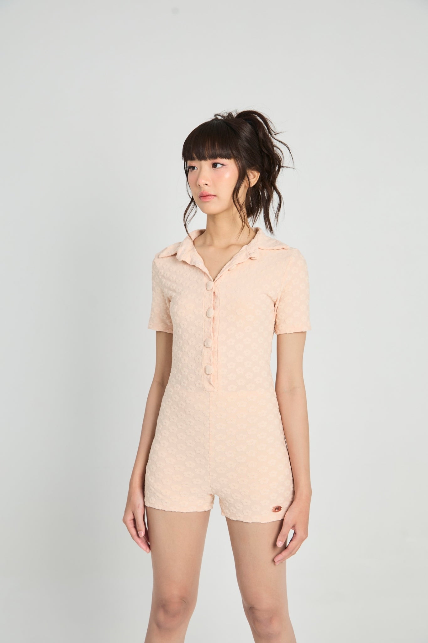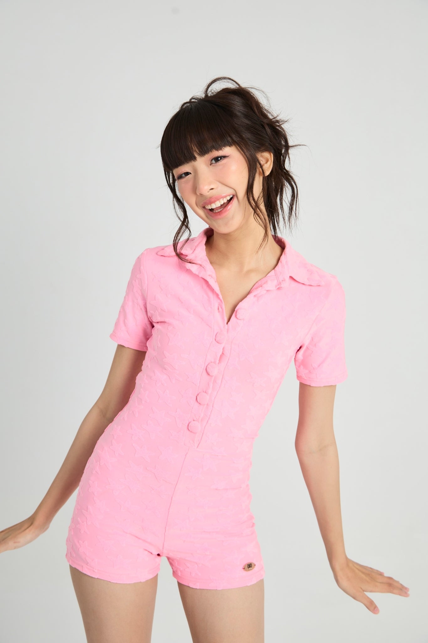 xADORABLE STAR-TEXTURED BUTTON-UP PLAYSUIT. FEATURING AN ALL-OVER STAR PATTERN, THIS PLAYSUIT ADDS A FUN, PLAYFUL TOUCH TO YOUR CASUAL WARDROBE. THE FITTED SILHOUETTE, SHORT SLEEVES, AND COLLARED NECKLINE CREATE A CHIC YET COMFORTABLE LOOK PERFECT FOR SUMMER DAYS OR PLAYFUL OUTINGS. WITH A BUTTON-UP FRONT AND SOFT, STRETCHY FABRIC, THIS PLAYSUIT WILL HAVE YOU LOOKING EFFORTLESSLY STYLISH WHILE STAYING COMFORTABLE ALL DAY.