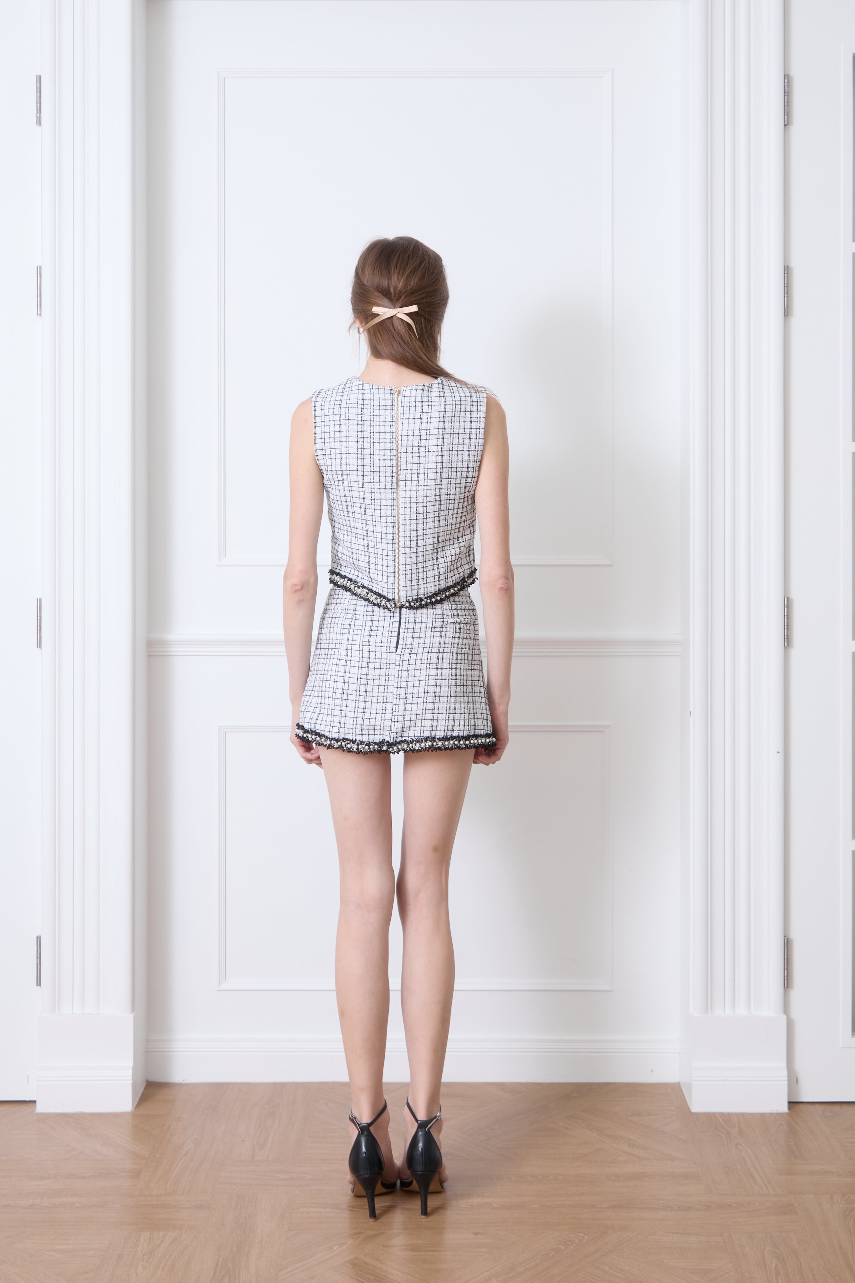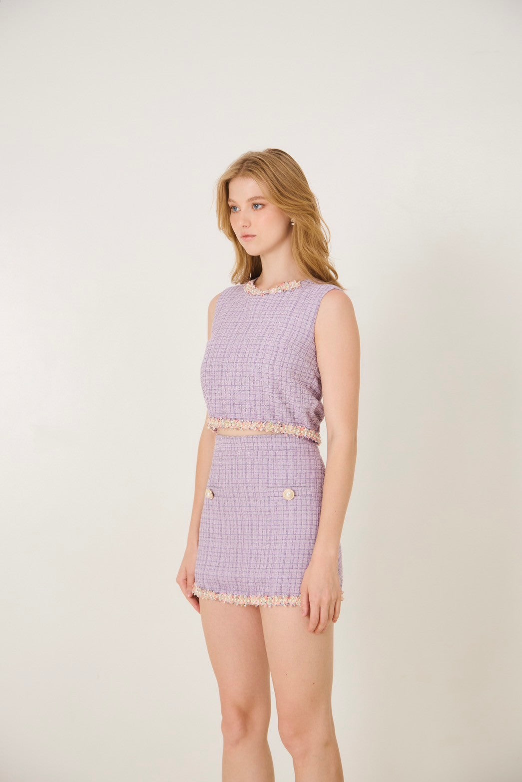 xTHIS MATCHING CROP TOP AND MINI SKIRT DUO FEATURES A SOPHISTICATED TWEED TEXTURE, ACCENTUATED BY CHARMING FLORAL FRINGE DETAILING AT THE EDGES. THE TOP BOASTS A CLASSIC SLEEVELESS CUT, WHILE THE HIGH-WAISTED MINI SKIRT INCLUDES PEARL-BUTTON ACCENTS FOR A TOUCH OF ELEGANCE. PERFECT FOR DAYTIME EVENTS OR A STYLISH BRUNCH WITH FRIENDS, THIS SET BRINGS TIMELESS CHARM WITH A MODERN TWIST.